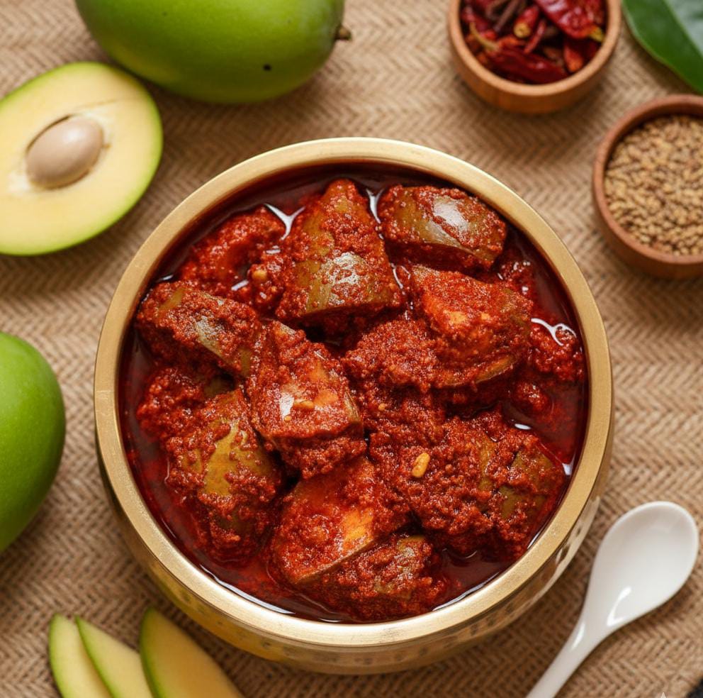 Authentic Andhra Avakaya Mango Pickle made with fresh raw mangoes, cold-pressed gingelly oil, premium spices and traditional recipe. 100% homemade, no preservatives, rich taste and long shelf life.