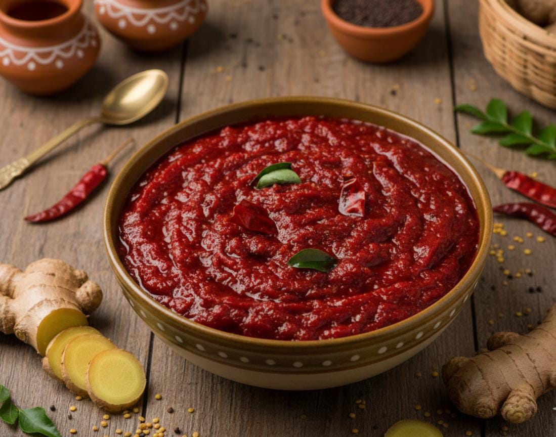 Traditional Andhra-style Ginger Pickle (Allam Pachadi) made with fresh ginger, jaggery, aromatic spices and cold-pressed gingelly oil. 100% homemade, no preservatives, perfect balance of sweet, spicy and tangy taste.