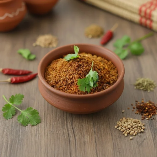 Authentic Kothimeera Karampodi prepared using fresh coriander leaves and traditional spices. A flavorful, aromatic South Indian chutney powder that enhances everyday meals. Perfect with hot rice, ghee, idli, dosa, and chapati. 100% natural and preservative-free.