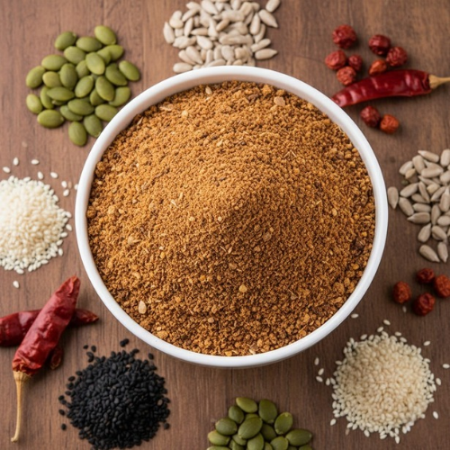 Multiseed Karampodi is a wholesome South Indian chutney powder prepared using a carefully selected mix of nutrient-rich seeds, roasted to perfection and blended with aromatic spices. This podi combines traditional taste with modern nutrition, making it ideal for health-conscious families.