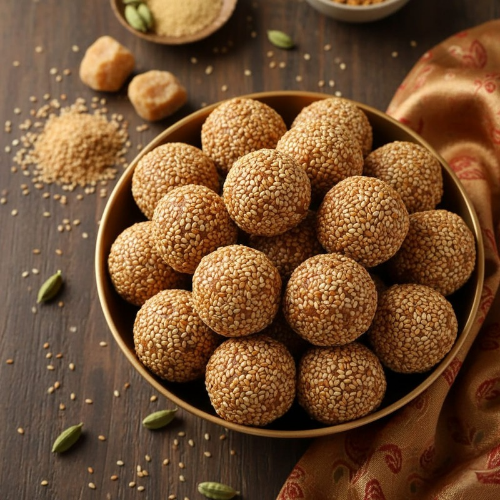 Traditional Nuvvulu Laddu made with roasted sesame seeds and pure jaggery. Calcium-rich healthy sweet for bone strength and energy.