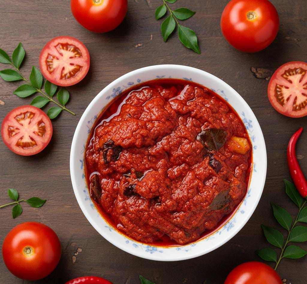 Our Tomato Pickle (Tomato Pachadi) is prepared using fresh hand-picked ripe tomatoes and a traditional Andhra recipe. The tomatoes are slow-cooked to retain natural flavor and blended with premium spices and cold-pressed gingelly oil to create a perfect balance of spice, tanginess, and aroma.